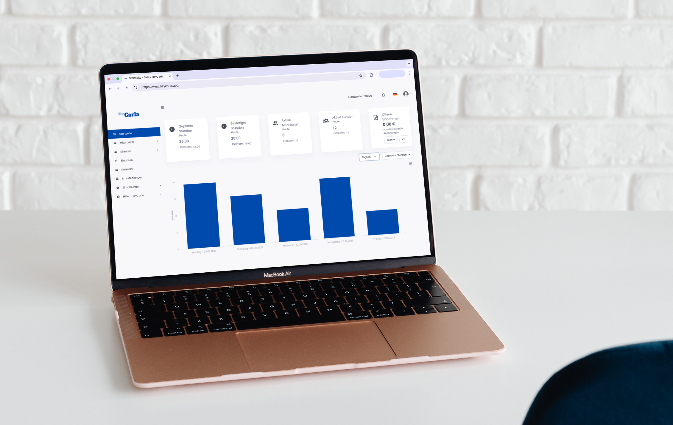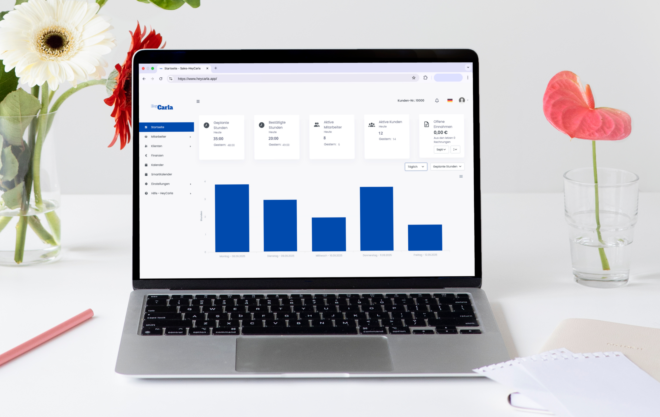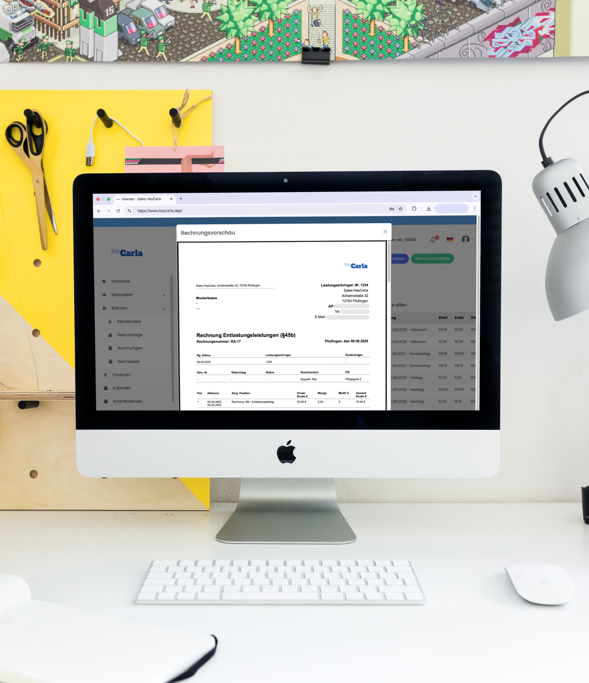HeyCarla automatisiert Ihre Verwaltung von Klienten- und Tourenplanung bis zur automatischen Rechnungsstellung. Die Plattform erleichtert Mitarbeiterorganisation, sorgt für klare Einsatzpläne und bietet mobilen Zugriff auf alle wichtigen Daten.