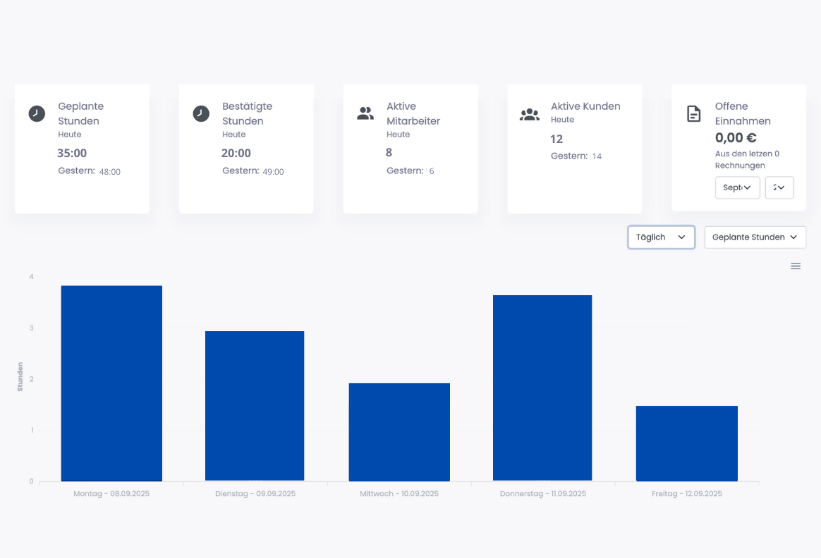 Behalte jederzeit den Überblick über geplante und geleistete Stunden, aktive Mitarbeiter und aktive Kunden. Vergleiche deine Kennzahlen täglich, wöchentlich oder monatlich und erkenne Trends auf einen Blick.